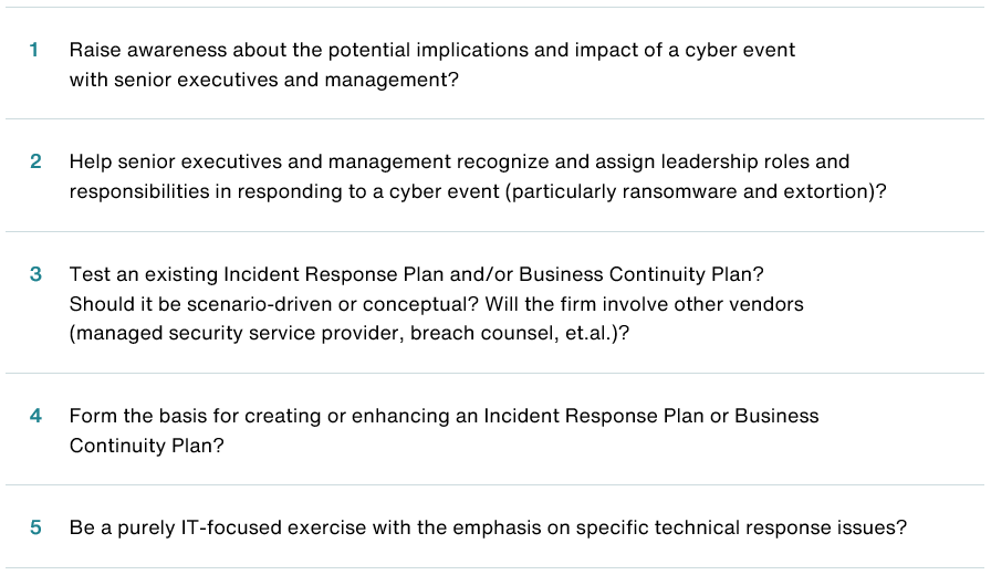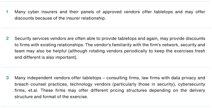 Each of these would be a very different exercise and depending on the maturity and level of preparedness within the firm there may be value in holding several tabletops as part of an overall development process, using different vendors, and engaging different constituencies within the firm.