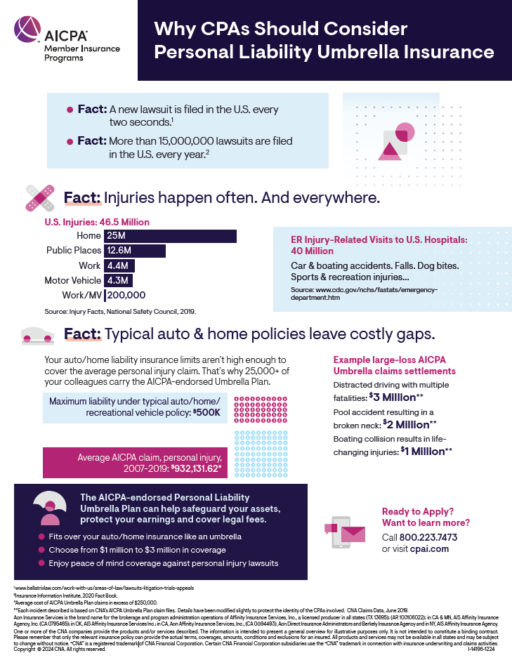 Contact Us Search Plans Back Plans for Me + My Family Life Insurance GVUL notice for new business Life Plan Comparison CPA Life Spouse Life Level Premium Term Life Insurance Spouse Level Premium Term Group Variable Universal Life Long Term Disability About the Underwriter What it covers NEW APP Why CPAs need it What is Long Term Disability Insurance What It Costs Why CPAs choose AICPA-endorsed Long Term Disability Who is eligible for Long Term Disability? Identity Theft About the Provider What it protects Why CPAs choose Aura Why do CPAs choose it What is All-In-One Digital Security? What It Costs Eligibility Auto/Vehicle About the Carrier What it covers Why do CPAs select it? What is Auto Insurance? What It Costs Why CPAs choose AICPA Auto Insurance Eligibility Health Insurance About the Platform What it provides Why CPAs need it What is Health Insurance What It Costs Why CPAs choose Stride Health Eligibility Homeowners Insurance About the Carrier What it covers Why do CPAs select it What is Homeowners Insurance? What It Costs Why CPAs choose AICPA Homeowners Insurance Eligibility Long-Term Care Long Term Care - National Thank you Medicare Supplement Personal Liability Umbrella About the Underwriter Eligibility What is Personal Liability Umbrella? What it covers What it costs Why CPAs Need It Why CPAs choose AICPA Personal Liability Umbrella Renters Insurance About the Carrier What it covers Why CPAs select it What is Renters Insurance? What It Costs Why CPAs choose AICPA Renters Insurance Eligibility View All Plans for My Firm Professional Liability CNA Disclosure Professional Liability for Small Firms Professional Liability Premier Plan Professional Liability for National and Regional Firms Discover the benefits of AICPA-endorsed Professional Liability coverage What is Professional Liability insurance for Accountants? AICPA Professional Liability Insurance Program Which plan is right for your firm? Plan Cards Employment Practices Liability About the Underwriter Group Identify Theft Contact Us What it covers Why CPAs select it? What is Employment Practices Liability? What it costs Why firms choose AICPA Employment Practices Liability Eligibility Cyber Liability About the Underwriter What it covers Why CPAs select it? What is a Cyber Liability endorsement? What it costs Why CPAs choose supplemental cyber liability endorsements Eligibility Business Overhead Expense About the Underwriter What it covers Why CPAs need it What is Business Overhead Expense (BOE) Insurance What It Costs Why CPAs choose Business Overhead Expense (BOE) Insurance Who is eligible for AICPA BOE Insurance Commercial Property and Liability About the Underwriter What is Commercial Property and Liability? What It costs What it covers Why CPAs choose Commercial Property and Liability Why do CPAs need it Group Life and Disability Group Life under 25 employees Group life 25 or more employees About the Underwriter What it covers What is Group Insurance What it costs Why CPA Firms choose AICPA Group Life Insurance Who is eligible for AICPA-endorsed Group Elite Insurance Group Personal Excess Liability About the Underwriter Eligibility What is Group Personal Excess Liability? What it covers Why firms select it Why firms choose Group Personal Excess Liability Specialty Coverage About the Provider What it covers Why do CPAs need it What It Costs Why CPAs choose AICPA Specialty Coverage Eligibility Employee Theft Endorsement Group Identify Theft Contact Us What is Employee Theft Coverage? What is Employee Theft Coverage? What is Employee Theft Coverage? What it covers Eligibility Why purchase the Employee Theft Endorsement? View All Plans for My Retirement Life Insurance Medicare Supplement Standard Medicare West Virginia Medicare Virginia Medicare Oklahoma Medicare Texas Medicare Colorado Medicare Ohio Medicare Idaho Medicare Alaska Medicare Massachusetts Medicare Wisconsin Medicare Long-Term Care Personal Liability Umbrella View All Education & Resources Back Me & My Family Auto tips Someone hit my parked car. What should I do? “Full Coverage” Car Insurance Moving and car insurance What is the best time of the year to shop for car insurance? How to get the best car insurance in 5 steps Here are 9 questions you should always ask your car insurance company What to do after a car accident Will the make and model of my car affect insurance rates? Frequently asked questions about insurance and electric cars 5 Tips to Follow After a Car Accident 13 Ways to Lower Your Car Insurance Rate How does inflation affect insurance rates? 5 reasons your car insurance rate changes Safe Driving Tips Disability insurance tips Disability Insurance for Accountants 3 simple steps to help lower your risk of a disability How Life and Disability Insurance can help protect against life’s twists and turns. Differences between Short Term and Long Term Disability explained Long-term disability coverage explained Disability Insurance Needs Estimator Health & Wellness tips How Much Sugar is Hiding in Your Food? Understanding and Reducing Microstress in Your Life Most common causes of disabilities and how to prevent them One of the Most Important Steps You Can Take to Improve Your Health Vitamin D - Are you getting the right amount? Homeowner tips What does renters insurance cover? 7 Tips for Holiday Home Fire Safety Your Wine Collection: Preserving Value Beyond Taste Your Jewelry Collection: Worth Protecting Beyond Sentimental Value How does a second home insurance policy work? How to Avoid Home Contractor Scams A Guide for What to Do to Prepare and Recovery from a Hurricane Home Insurance Deductibles: Frequently asked questions (FAQs) Tips for insuring your high-value home What isn't covered by homeowners insurance? Home sharing and your insurance: What you need to know Moving and your home insurance How to keep your valuables safe from harm Identity Theft tips The Holiday Guide to Safer Online Shopping A great way to avoid hackers? Password managers